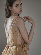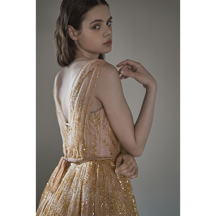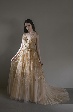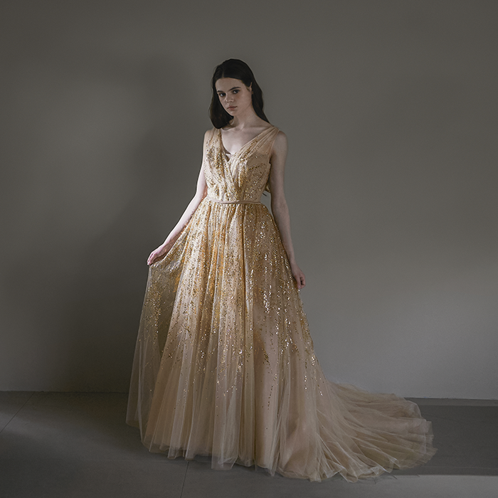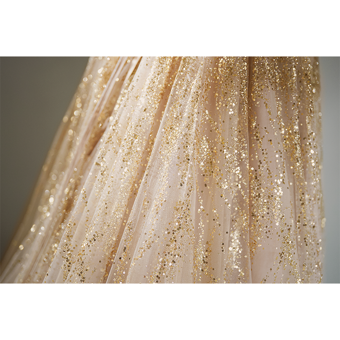 繊細なスパンコールが動くたびに煌めくエレガントなドレス。華やかさとニュアンスカラーのナチュラル感が引き立て合い、優しくかつ主役感のあるカラードレス。