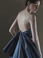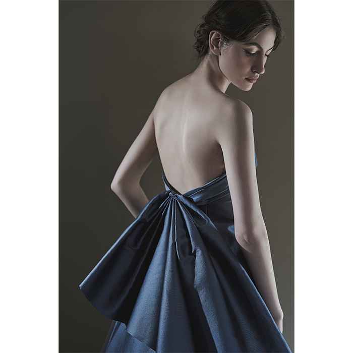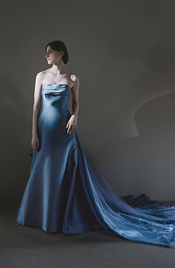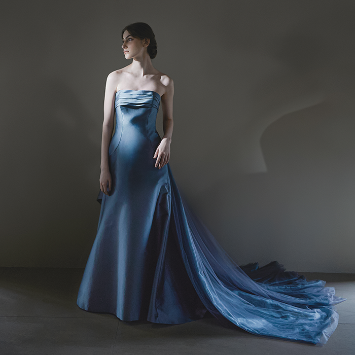 張り感のあるサテン素材でバックリボンまで構築的に創られたソフトマーメイドドレス。すっきりしたシルエットとアンニュイなグレイッシュカラーでモダンでスタイリッシュな花嫁を演出。
