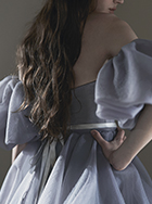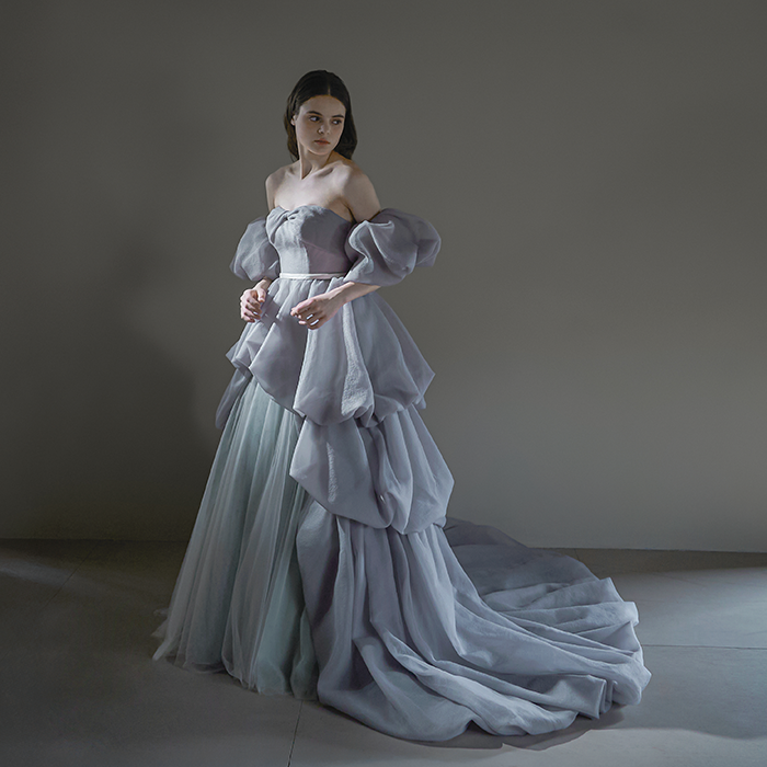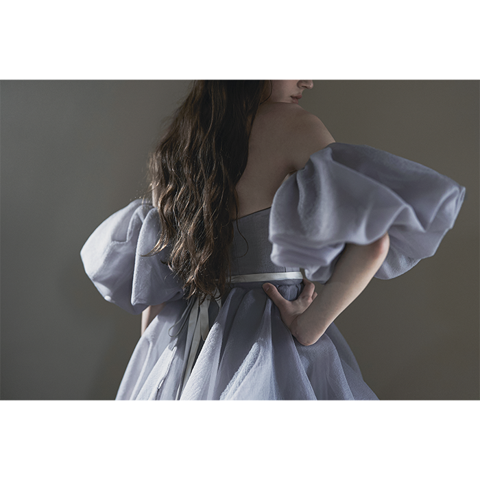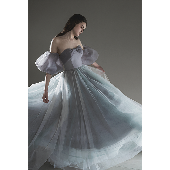 クールとフェミニンが融合するニュアンスブルーのカラードレス。パフスリーブと同素材のバルーンスカートはボリューム感がありながら、ウエストリボンでスタイルをアップ。スカートのボリューム次第で、シーンや好みに合わせたスタイリングを。