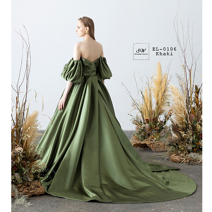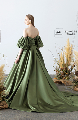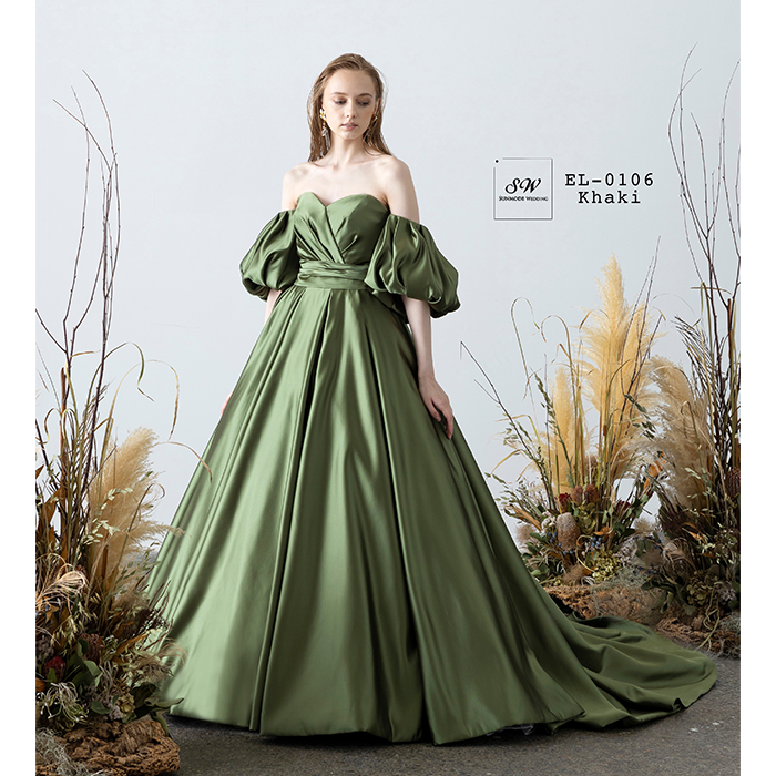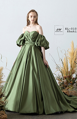 上質なサテンが美しい光沢を放つカーキのカラードレス。トレンドのドロップパフスリーブがシンプルなドレスに華やかさを与えます。お洒落花嫁にお勧めの一着。