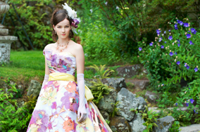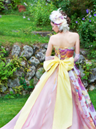 独特な花柄のジャガードが他にはない上品な存在感を放つ1着です。オレンジ色のシャンタンベルトがドレス全体を引き締め、華やかさをプラスします。バックスタイルはソフトなシャンブレーオーガンジーで、歩くたびに揺れ動きフロントとは異なる印象を与えます。シャンタンで結んだリボンの上にシルクサテンオーガンのお花を施しバックスタイルの華やかさがより一層際立ちます。
