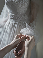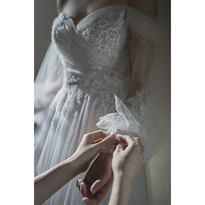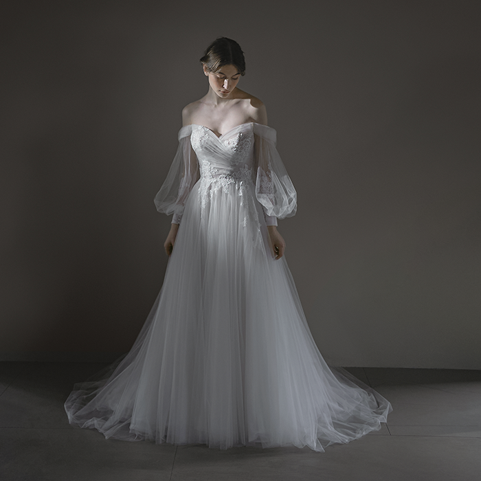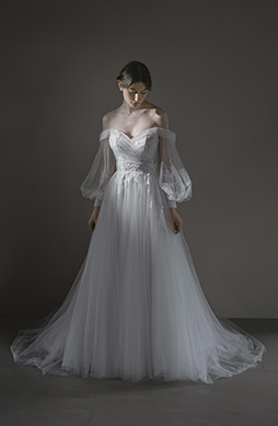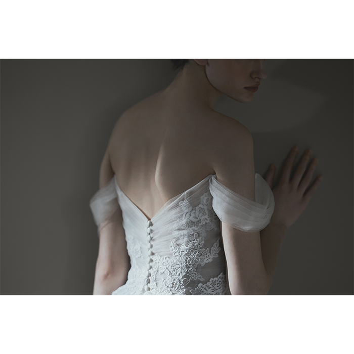 ブラッシュカラーがロマンティックな印象の大人の可愛さ漂うドレス。ゆとりのあるやわらかなシフォン素材のスリーブは着脱可能なため、パーツの有無で表情の変わるショルダーデザインが特徴です。
