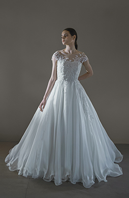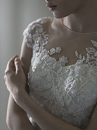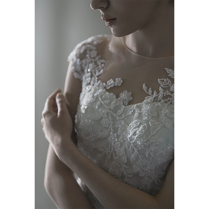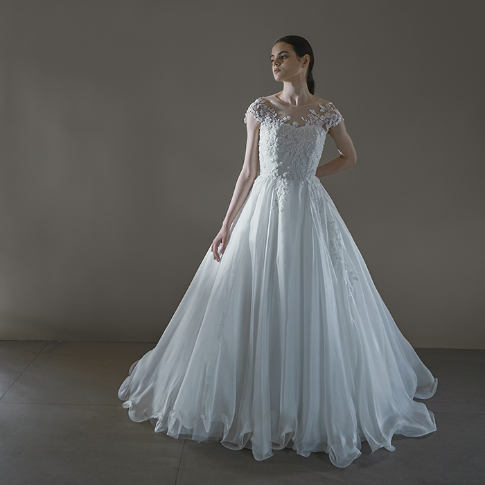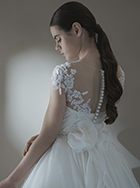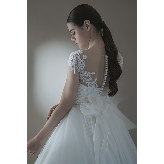 そよぐ花びらのように、ふんわりとしたAラインのオーガンジースカートが愛らしいドレス。ビジューが施された繊細なフラワーの刺繍がデコルテからバックスタイルをより美しく彩ります。